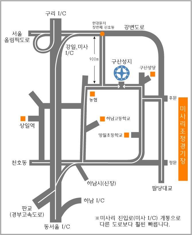 ¢º ¼¿ï¹æÇâ¿¡¼ ¿À½Ã´Â ±æ ¿Ã¸²Çȵµ·Î °ÀÏIC Áö³ª ¹Ì»ç¸® ¹æÇâÀÇ Ã¹¹øÂ° ½ÅÈ£µî(¼±µ¿»ï°Å¸®)¿¡¼ ¿ìȸÀüÈÄ, ¾à 1,300m ÁöÁ¡¿¡ ÀÖÀ½ ¢º °í¼Óµµ·Î ÀÌ¿ë½Ã 1) °æºÎ°í¼Óµµ·Î : ÆÇ±³¿¡¼ ±¸¸®°£ °í¼Óµµ·Î ÁøÀÔÇÏ¿© °ÀÏIC¿¡¼ ¹Ì»ç¸®ÂÊÀ¸·Î ³ª¿Í¼ ù ¹øÂ° ½ÅÈ£¿¡¼ (¼±µ¿»ï°Å¸®)¿ìȸÀü ÈÄ, ¾à 1,300m ÁöÁ¡¿¡ ÀÖÀ½ 2) Áߺΰí¼Óµµ·Î : °ÀÏIC¿¡¼ ¹Ì»ç¸®¹æÇâ Ãⱸ·Î³ª¿Í Á÷ÁøÇÏ´Ù°¡ ù¹øÂ° ½ÅÈ£(¼±µ¿»ï°Å¸®)¿¡¼ ¿ìȸÀüÈÄ ¾à 1,300mÁöÁ¡¿¡ ÀÖÀ½ 3) ¼Çذí¼Óµµ·Î : ¿Ü°û¼øÈ¯µµ·Î¿¡¼ ±¸¸®¹æÇâÀ¸·Î ¿À´Ù°¡ °ÀÏ IC¿¡¼ ¹Ì»ç¸® ¹æÇâ Ãⱸ·Î ³ª¿Í ù ¹øÂ° ½ÅÈ£(¼±µ¿»ï°Å¸®)¿¡¼ ¿ìȸÀü ÈÄ, ¾à 1,300m ÁöÁ¡¿¡ ÀÖÀ½ ¡á ±¸¸®, ÀÇÁ¤ºÎ ¹æÇâ °µ¿´ë±³°Ç³Ê °ÀÏIC¿¡¼ ¹Ì»ç¸®¹æÇâÀ¸·Î UÅÏÇÏ¿© ¹Ì»ç¸®·Î¿À´Ù°¡ ù¹øÂ° ½ÅÈ£(¼±µ¿»ï°Å¸®)¿¡¼ ¿ìȸÀüÈÄ, ¾à1,300m ÁöÁ¡¿¡ ÀÖÀ½ ¡á Çϳ²½Ã³»(½ÅÀå)¹æÇâ Çϳ²½Ã ½ÅÀå½ÃÀå LG¸¶Æ®¿¡¼ 3¹ø ¸¶À»¹ö½º·Î ±¸»ê½Äǰ¿¡¼ ÇÏÂ÷ÇÏ¸é µµº¸ ¾à 200m ÁöÁ¡¿¡ ÀÖÀ½